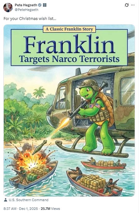 然而,赫格塞思发布的这张“恶搞版”图书封面的书名为“富兰克林打击毒品恐怖分子”:画面中,这只同名小乌龟身穿军装,站在直升机上,手持火箭筒向满载货物的船只和持枪人员开火。“把它列入你的圣诞愿望清单吧。”赫格塞思在配文中写道。
