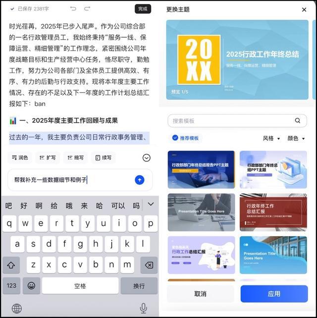 千问的智能编辑器支持更多精细化操作。对于文档,用户不仅可对文字直接删改,更能调用 AI 能力对特定段落进行润色、扩写或风格调整。对于 PPT 内容,用户也可直接通过对话调整大纲与正文内容,以及一键智能更换模版。除了生成、编辑、格式调整外,千问还支持 Word / PPT / PDF / Excel 等各类格式转换,确保用户相关操作在一个 App 里就能完成。